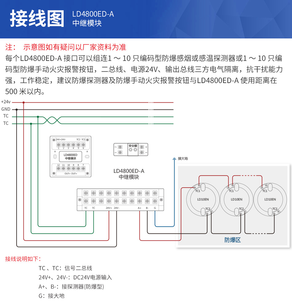 3、建議防爆探測(cè)器及防爆手動(dòng)火災(zāi)報(bào)警按鈕與LD4800ED-A使用距離在500米以?xún)?nèi)。