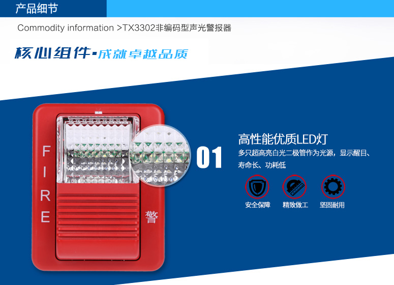TX3302聲光警報(bào)器(以下簡稱聲光警報(bào)器),是一種安裝在現(xiàn)場的聲光報(bào)警設(shè)備。采用高亮度的LED光源,聲光警報(bào)器啟動(dòng)后發(fā)出強(qiáng)烈的聲光報(bào)警信號(hào),以達(dá)到提醒現(xiàn)場人員注意的目的。