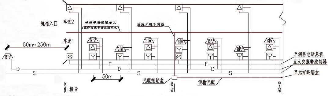 分布式光纖線型感溫火災探測器(或光纖光柵線型感溫火災探測器)應設置在車道頂部距頂棚100mm~200mm,光纖光柵線型感溫火災探測器的光柵間距不應大于10m;每根分布式光纖線型感溫火災探測器和光纖光柵線型感溫火災探測器保護車道的數(shù)量不應超過2 條;探測范圍要求整個隧道全部覆蓋無探測盲區(qū)。