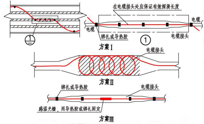 線型感溫火災探測器應采用接觸式的敷設方式對隧道內的所有的動力電纜進行探測;分布式線型光纖感溫火災探測器在電纜接頭、端子等發(fā)熱部位敷設時,其感溫光纜的延展長度不應少于探測單元長度的1.5 倍,在電纜接頭處應采用方案Ⅱ的方式;光纖光柵線型感溫火災探測器在電纜接頭、端子等發(fā)熱部位應設置感溫光柵單元,應才用方案Ⅰ、Ⅲ的方式。如圖6 所示: