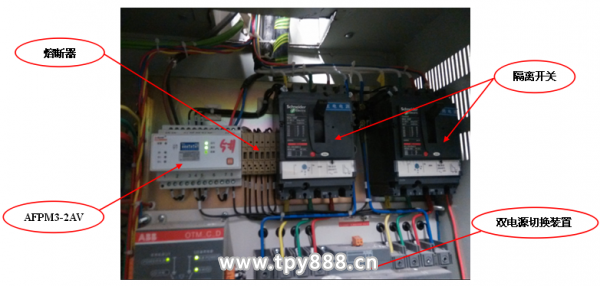 本商場(chǎng)綜合樓項(xiàng)目的AFPM3-2AV三相交流雙電源電壓傳感器安裝于斷路器或隔離開關(guān)的輸出端和雙電源切換裝置的輸入端之間,主電源電壓信號(hào)接1,2,3,4這四個(gè)端子,備用電源電壓信號(hào)接5,6,7,8這四個(gè)端子,以位于地下室區(qū)域的消火栓泵配電箱雙電壓監(jiān)控為例,傳感器AFPM3-2AV安裝位置示意圖如圖2所示,實(shí)物安裝位置圖如圖3所示,電壓信號(hào)接線示意圖如圖4所示。