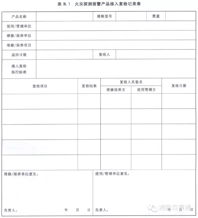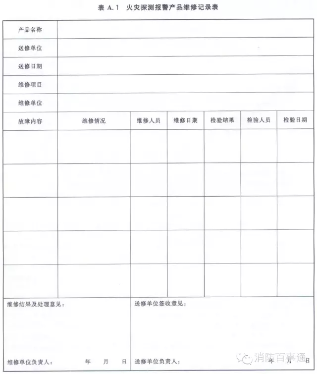3.1.6承擔維修的企業(yè)應做好維修記錄,與產品使用或管理單位各執(zhí)一份,并保存至該產品報廢。火災探測報警產品維修記錄表的格式參見附錄A。