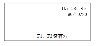密碼正確后顯示如上面菜單,密碼錯誤則返回封面菜單。 其中小時處(即數(shù)字“10”反顯,用“F1”鍵進行切換,依次反顯時、分、秒、年、月、日,用“F2”鍵進行反顯處時間修改,每按一次“F2”鍵,反顯處數(shù)字增一。